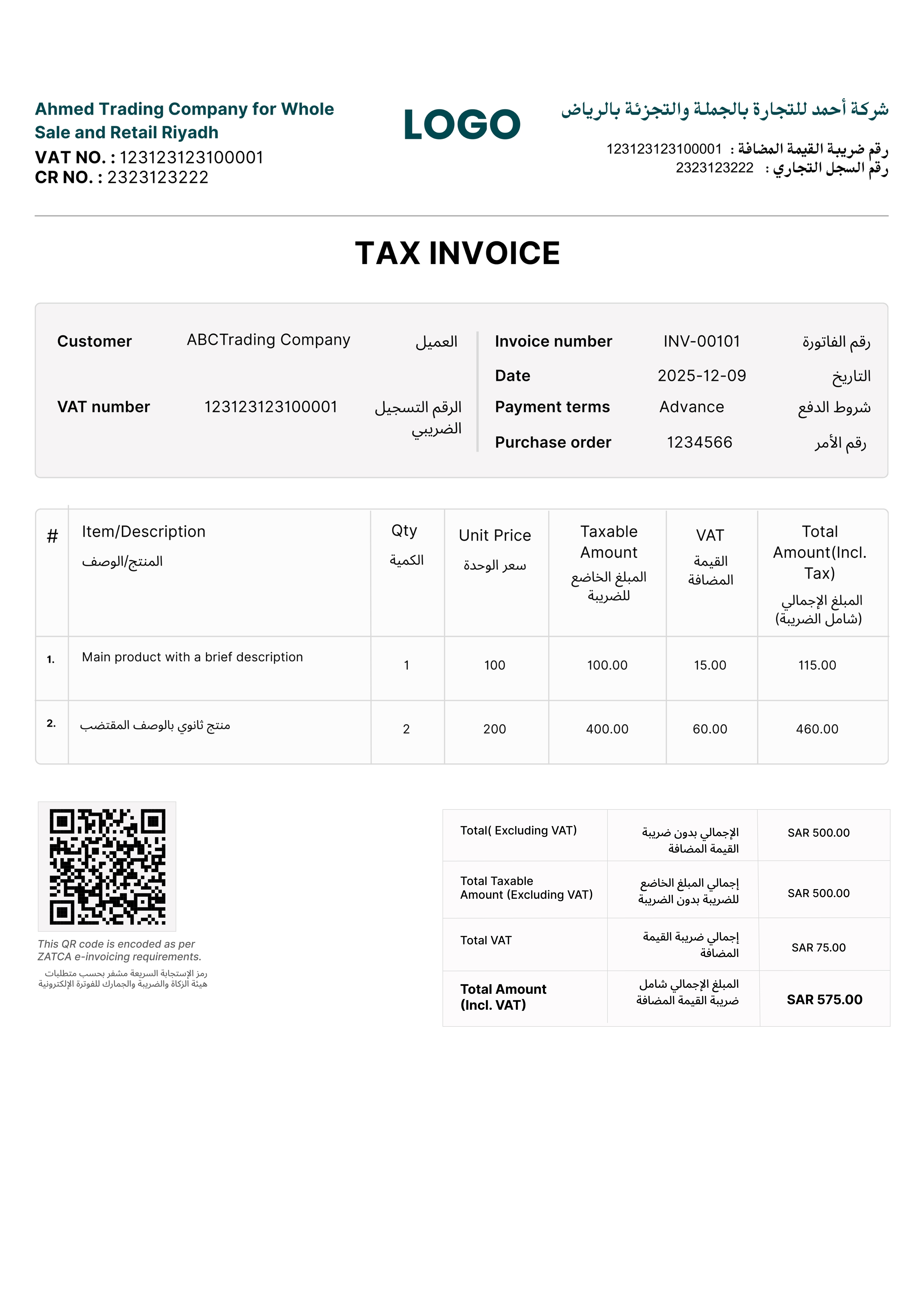Create, manage, and store ZATCA-compliant invoices with QR codes, XML (FATOORA) formatting, and real-time VAT calculations, fully aligned with Saudi e-invoicing regulations